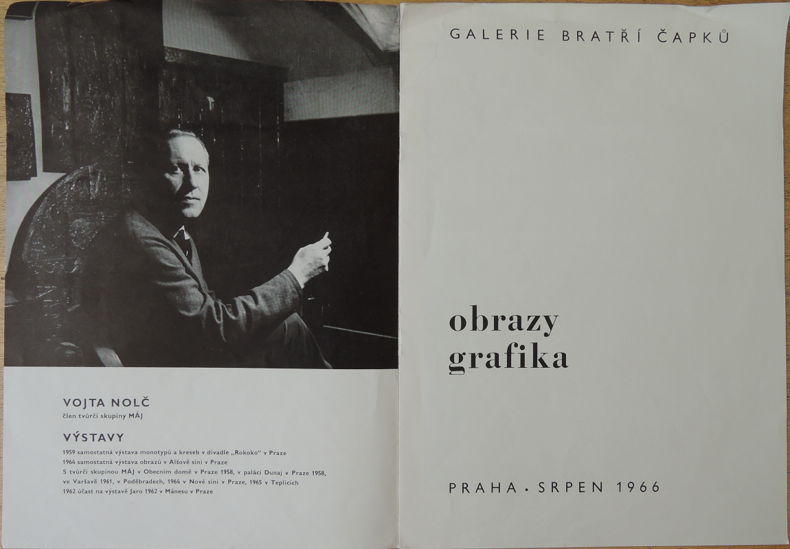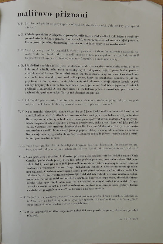 V. N. Staré přátelství s tiskařem A. Černým, přítelem a spolužákem velkého českého malíře Karla Černého (pouhá shoda jmen), který tiskl jeho grafické prvotiny, mne vedlo k tisku. Tisk je mi velmi blízký, neboť již v roce 1959 jsem měl samostatnou výstavu monotypů. Bohaté tiskařské zkušenosti a všestranná znalost různých tiskařských technik A. Černého mi umožňují odbornou realizaci. V podstatě obnovujeme starou praxi přímé spolupráce výtvarníka s uměleckým tiskařem. Využíváme všestranně nejrůznějších tiskařských technik, zejména reliéfního tiskařského procesu, ať už omítkového reliéfu, reliéfního barevného papírořezu, plastického hloubkového tisku apod. Nejde nám však jen o vytváření monotypů, nýbrž také o tisk různých variací na tentýž námět a o opakovatelnost rozmnožování ve smyslu běžné grafiky. Jedním z našich cílů je „grafický obraz", ke kterému naše úsilí směřuje.